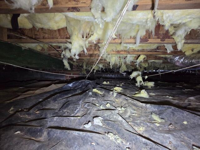 This Greensboro, NC crawl space was showing clear signs of moisture issues, including falling insulation, exposed ground, and an ineffective plastic liner that allowed humidity to linger. Excess moisture in crawl spaces can lead to mold growth, wood rot, poor air quality, and rising energy costs.