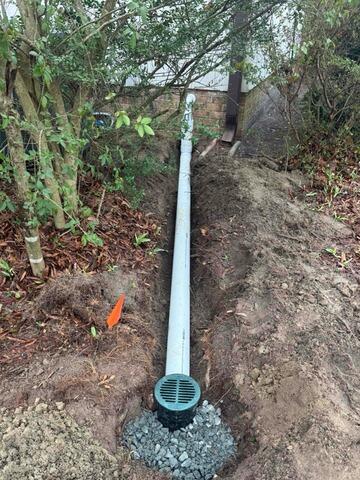 As part of this basement waterproofing project in Greensboro, NC, our team installed a dedicated exterior drainage line to safely carry water away from the home’s foundation. The discharge line was carefully trenched and extended away from the property, directing water to a properly placed outlet to prevent pooling near the structure.