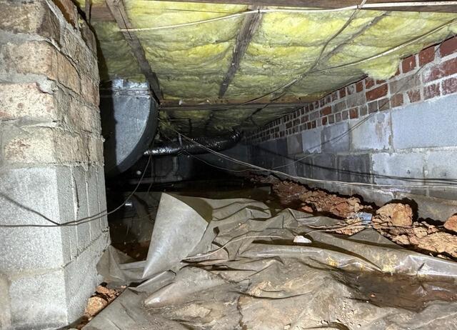 This Greensboro, NC crawl space was showing clear signs of moisture issues, including falling insulation, exposed ground, and an ineffective plastic liner that allowed humidity to linger. Excess moisture in crawl spaces can lead to mold growth, wood rot, poor air quality, and rising energy costs.