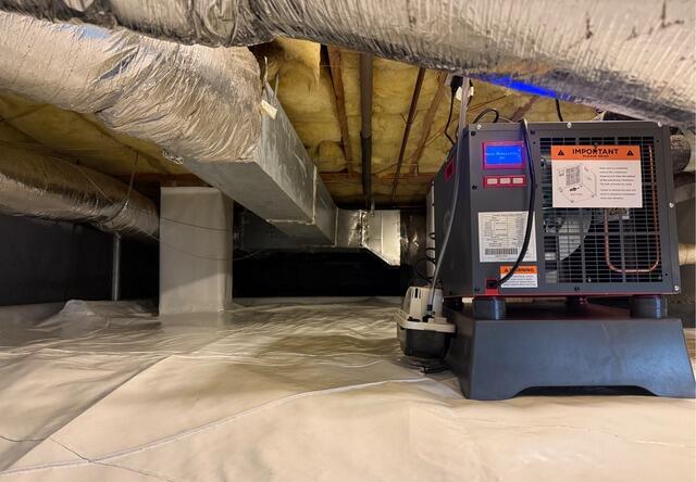Our team installed a full vapor barrier encapsulation system to seal out ground moisture and protect the space. We also added a SaniDry dehumidifier to control humidity levels and keep the crawlspace dry year-round.