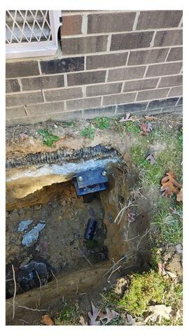 To permanently stabilize the structure, our team installed Helical Piers, a deep-foundation support system designed to reach strong, load-bearing soil. After excavating along the footing, the piers were driven into the ground using hydraulic equipment. Once proper depth and torque were achieved, the system was secured to the foundation to lift and lock it in place.