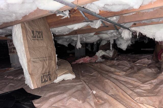 Water and high humidity had completely ruined this crawl space. The insulation was ripping apart because of the dampness, and mold was growing on the floor joists. We cleaned up the crawl space and carefully installed our reliable vapor barrier to assist in keeping the humidity, mold growth, and creature nesting down.